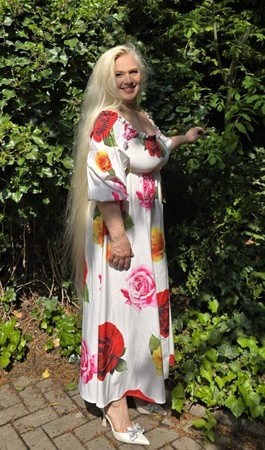 Haare:blond, rückenlang, wellig
